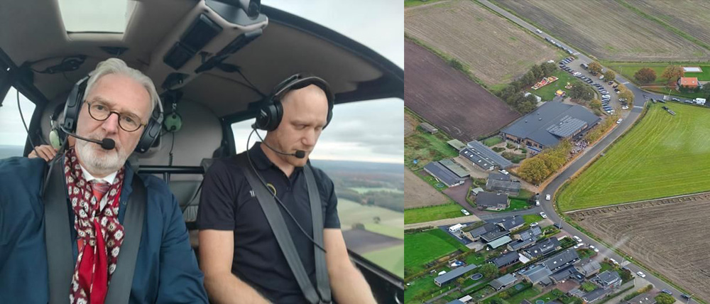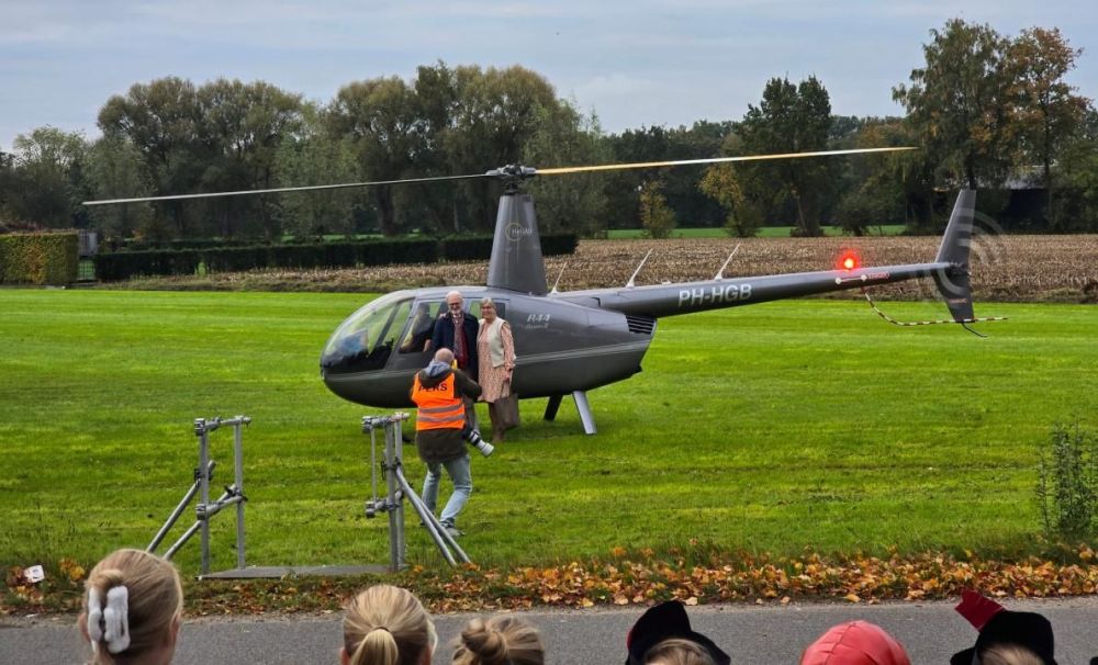 Daarna werden we naar een geheime bestemming gebracht. Wie schetst onze verbazing toen we ergens in Harskamp in een helikopter terecht kwamen. Wat een geweldige ervaring was dat. De piloot vroeg waar ik heen wilde vliegen. Ik vroeg me af of Nunspeet een mogelijkheid was. ‘Dat moet lukken’, zei de piloot. ‘Dat is een paar minuten vliegen.’ En dat bleek ook het geval. Je zou zo’n ding privé moeten hebben. Dan is het naar school reizen een peulenschilletje. Na een rondje boven Nunspeet gevlogen te hebben koersten we via de route die ik altijd rijd naar Barneveld. Na daar een rondje gevlogen te hebben landden we in het weiland tegenover de school. Wat een prachtige start van de dag was dat.