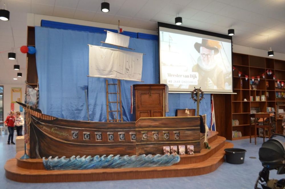 Dank aan collega’s en de ouders die hebben geholpen om alles mogelijk te maken. En niet te vergeten, Ad van Veen. Hij heeft een grote inbreng gehad bij het decor bouwen op het podium. Ook hartelijk dank daarvoor. Het was ook heel fijn dat veel ouders langs kwamen om te feliciteren. Ook hartelijk dank daarvoor en voor alle goede wensen.
