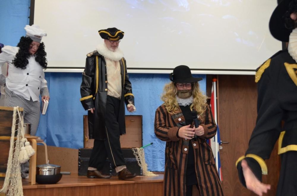 Vervolgens werden we toegezongen door alle aanwezigen en werd er binnen een groot spektakel opgevoerd. Een prachtig decor was er gebouwd om in de sfeer van Piet Hein te komen. Na een spannende introductie moest ik aan de hand van een schatkaart op zoek naar de schat. Die werd gelukkig snel gevonden met behulp van mijn kleinkinderen.